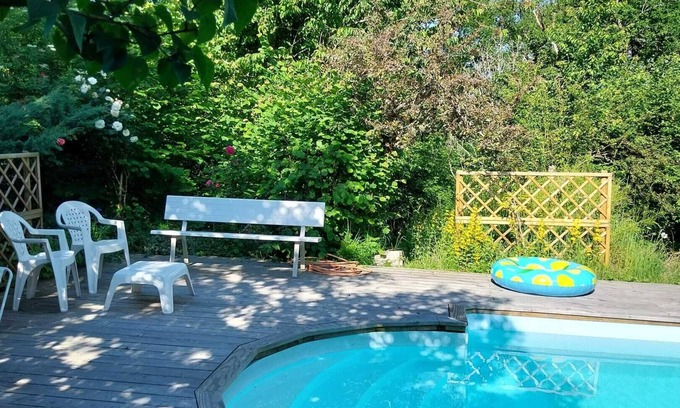 The spacious 1500 m² garden is entirely private and enclosed, ensuring tranquility and safety. The private pool, available from 30/05 to 30/09, is ready for your relaxation. Enjoy comfortable outdoor furniture and breathtaking views of the surrounding nature, perfect for barbecues with family or friends.