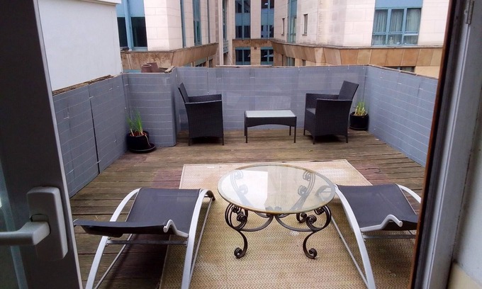 Metro de brouckère is 50m away. A paying parking is available nearby. There is a terrace shared with 3 other apartments.