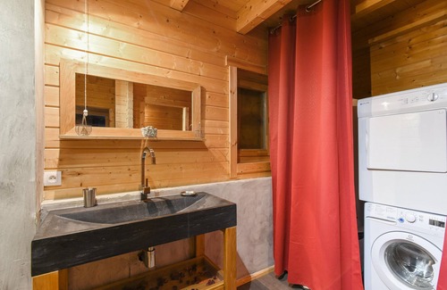 The chalet features central heating, a dryer, ironing equipment, a vacuum cleaner, cleaning products, a washing machine, a jacuzzi and air conditioning.