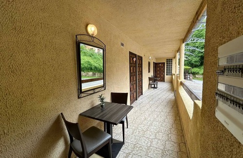 The apartment features lovely mountain views and a communal outdoor space perfect for relaxing outdoors. Enjoy a quiet moment with a cup of coffee and fresh mountain air. Parking is included in the rental price, making it easy to explore the area by car.