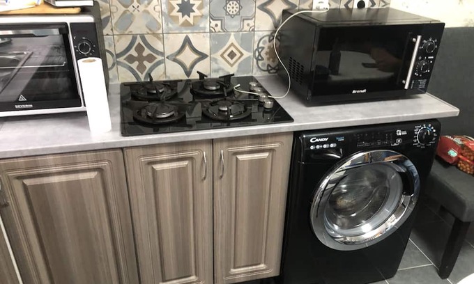 The house features a washing machine, a dressing room, ironing equipment, cleaning products and a vacuum cleaner.