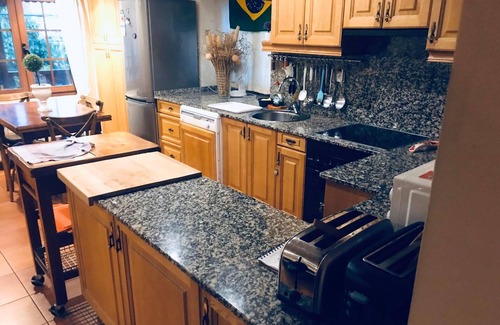 The house features central heating, a fan, cleaning products, a washing machine and ironing equipment.
