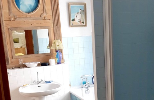The villa has 5 comfortable bedrooms, 1 including a double bed, 1 including a bunk bed, 1 including a double bed and a private bathroom with a bath tub and toilet, 1 including a double bed and a sofa bed and a private bathroom with a shower and toilet and 1 including a double bed and a sofa bed and a private bathroom with a bath tub, a shower and toilet. The bathroom is fitted with a shower and a toilet.