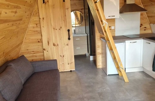 This chalet features a welcoming living area complete with a sofa and dining table for cozy shared meals. Thanks to its private entrance, you'll have the freedom to explore or unwind as you like. All modern amenities await you for a comfortable stay, including central heating and television.