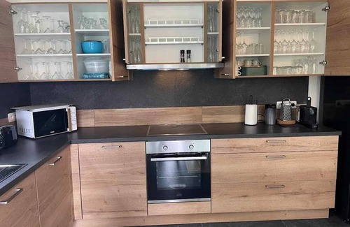 The exterior of the chalet features a lovely terrace, ideal for outdoor dining and relaxation. Enjoy the mild summer evenings with the private grill available. The spacious balcony offers a wonderful view of the surroundings, making it the perfect spot to unwind with a morning coffee or an evening drink.