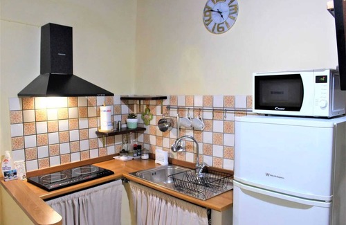 The living spaces of this holiday home are comfortable and well-equipped. The living room offers a TV and garden views, while the kitchen is fully equipped with an oven, microwave, refrigerator, and stove. A workspace with internet access is also available.