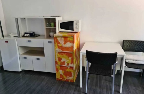 Indoors, the studio boasts a practical layout with a cozy living area featuring a sofa that converts into a comfortable bed. The kitchen is equipped with all the essential appliances, including a stove, microwave, and refrigerator, making cooking easy. The stylish bathroom has modern facilities and a shower. You can also request a baby cot if traveling with young ones.