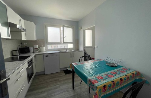 The flat features a bright and welcoming living space with a comfortable sofa and a flat-screen TV. The fully equipped kitchen invites you to prepare delicious meals with its many modern appliances: fridge, dishwasher, microwave, coffee maker, and more. A dining table is also available for convivial meals.
