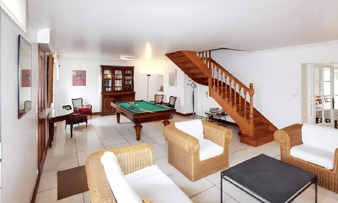 The common living areas are inviting and comfortable. The functional kitchen is equipped with modern appliances and has a dining area, making it easy to gather for homemade meals. The living room features a cozy sofa and a flat-screen TV, perfect for relaxing after a day of adventure. The pool table adds an extra layer of fun and entertainment.