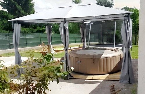 This house is surrounded by a lovely garden with a private entrance, where you can unwind. The outdoor furniture is perfect for al fresco dining or just enjoying a drink in the sunshine. The jacuzzi awaits you for moments of relaxation after a day of exploring the sights.