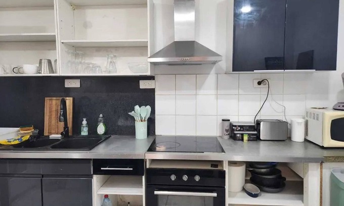 The apartment consists of a comfortable living room with a sofa, perfect for movie nights, and a fully equipped kitchen where you can prepare your meals. The dining table is ideal for sharing convivial moments. This bright and welcoming accommodation is designed to make you feel at home.
