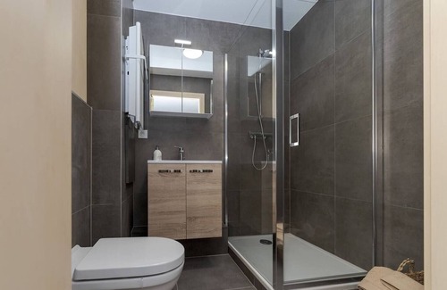 The apartment has a comfortable bedroom with a double bed. The bathroom is fitted with a shower and a toilet.