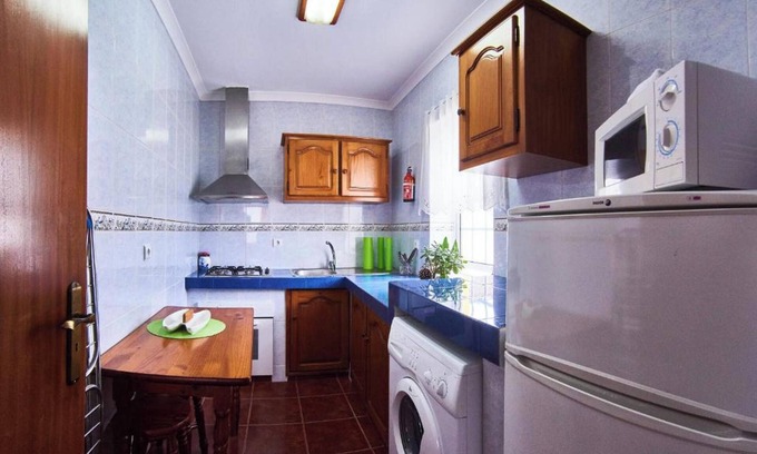Indoors, the apartment is bright and inviting, boasting an open living area with a comfortable sofa, dining space, and modern amenities. The fully equipped kitchen includes everything you need to prepare homemade meals during your stay.