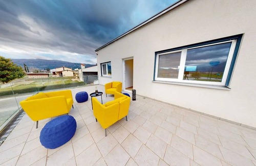 The beautiful garden is perfect for outdoor dining and relaxation. Enjoy long summer evenings on the terrace with a delicious meal prepared on the grill. The property’s location offers a fantastic view of the mountains, creating a peaceful atmosphere.