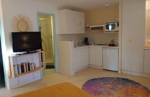 This 30 m² studio is designed for your comfort with a double bed, an en-suite bathroom featuring a shower and toilet. The living area includes a dining corner with table and chairs, a fully equipped kitchenette (cooking hob, microwave, refrigerator, coffee machine, and more), as well as a lounge with a flat-screen TV, fan, and dressing area. Towels and bed linens are provided.