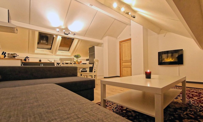 The living room features a fireplace, creating a warm and welcoming atmosphere. There is also a comfortable sofa and a flat-screen TV with free Netflix. The kitchen is fully equipped with an oven, stove, microwave, toaster, coffee maker, dishwasher, kettle, refrigerator, and freezer.