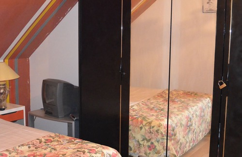 We rent a large room about 15m2, on the floor of our house. In this room, a 160 x 200 bed and a 90 x 190 bed, there is a small fridge, microwave, coffee maker, television.