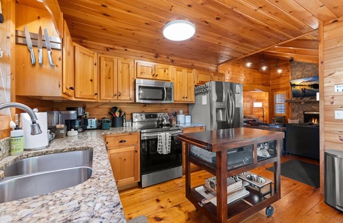 The array of luxurious features at Honeycomb Ridge elevates it as a prime wedding accommodation. Enjoy a delightful evening under the stars gathered around the fire table on the upper deck, or unwind in the six-person hot tub after a day of celebrating. The game room is perfect for entertaining guests with its arcade games and shuffleboard, while the home gym ensures everyone can stay active during their stay. Additional perks include a bourbon bar, a modern open-concept kitchen, and heated floors in the master bathroom, ensuring that comfort and style are always prioritized. Every detail has been meticulously crafted to provide both relaxation and entertainment so that you and your guests feel right at home.