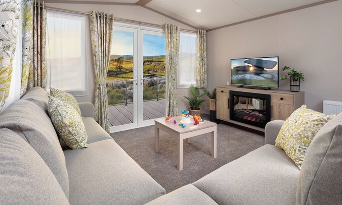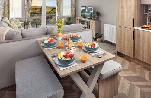 Flatscreen TV, shower, additional sleeping for two in the lounge area, kitchen including gas cooker, microwave and domestic fridge/freezer, and gas and electricity included. Bed linen included. Heating: Electric fire to the lounge, domestic central heating and double glazing. Access: 3 steps with handrail leading onto wrap-around decking.