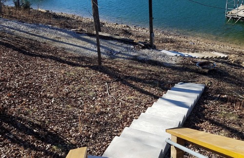 There are concrete stairs down to the shoreline making it so easy for everyone to enjoy the water. There is a nice deck overlooking the water and a propane grill for cooking outdoors. The fire pit is on the shoreline.