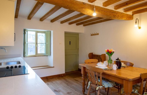 Stepping through the front stable door into the kitchen you can take off your boots at the wooden bench before popping the kettle on for a cup of tea out in the sunny and secluded garden. The kitchen has a wooden dining table where you can enjoy romantic home cooked meals together when you're not wining and dining at one of the local inns. In the cosy living room curl up on the plump sofa under the wooden beams and relax to the crackling fire in the wood burner. The shuttered windows look out over the quiet lane, used more by walkers than cars.