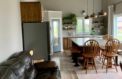 Hope's Anchor is a newly built and custom designed home (by us). Located 16 miles north of Pierre just off the shores of Lake Oahe. Here you can enjoy luxurious accommodations while feeling like you are outside. The scenic views from the home are lovely and guests can easily walk to the river. The neighborhood is peaceful. It is a great place to get away.