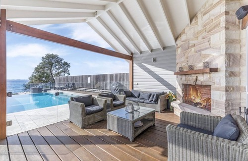 Multiple outdoor entertainment areas, BBQ, covered fireplace with outdoor lounges, and infinity pool offering the best views in Hyams Beach.