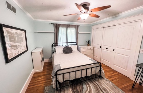 Down the hall are all the bedrooms and bathrooms. The master bedroom features a comfortable King size bed and large windows showing off the backyard. The attached bathroom is full of charm and offers a tub, shower and double sinks.