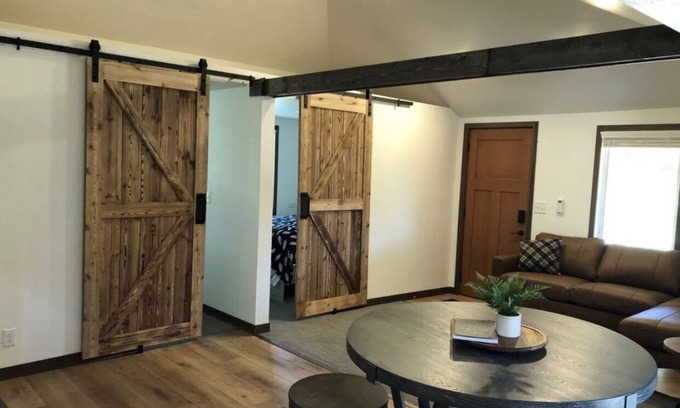 This 3BR 1BA cabin sleeps a total of 6 adults along with the possibility of 2 children sleeping on the Murphy bed. There is a large master bedroom with a brand-new king-size bed and a Murphy cabinet, two other bedrooms with full beds, along with a large walk-through bathroom with shower. The cabin also includes a fully equipped kitchen, a living room, a vaulted-ceiling dining area, a large, covered deck with seating/dining and a propane grill along with a private fire pit.