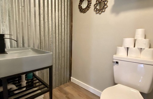This cozy, tiny cabin has a full bed with a dresser, a mini fridge, a microwave, a private deck, and a newly renovated bathroom (toilet and sink only). The cabin is located only a few feet from our shower house. Linen/bedding, bath towels, and a picnic area with a firepit are all provided. All our cabins have air conditioning, on-site coin-operated laundry, and high-speed internet. Coffee maker, linen/bedding, bath towels, basic dishware/utensils, and a propane grill are all provided.