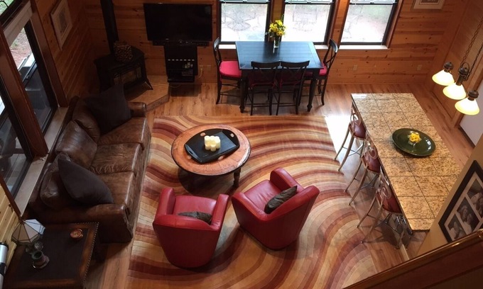 This quaint cabin is located on 5 acres of densely forested pine trees. Upstairs, the loft is furnished with a King Size Bed and a sitting area with two plush chairs and an ottoman. There is a half bath located at the top of the stairs. Vaulted pine ceilings tower above an open family room and kitchen area with a counter top bar. Downstairs has one bedroom with a full size bed and another room that has a twin/full bunk bed. There is a full size bathroom equipped with a tub/shower combo, heat lamp and heated floors.