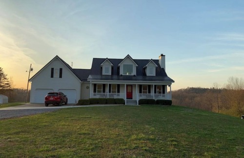 You cannot see the house from the road. The house has a private gravel driveway that is approximately 3/4 of a mile long. It is a steep, one lane driveway that opens up at the top to expose the beautiful hill-top farm and home. The home has three bedrooms, 2 1/2 baths, a private bonus room above the garage, large living room, formal dining room and a breakfast nook. The kitchen is equipped with dishes, pots and pans, a dishwasher, and a coffee pot. There is a washer and dryer available for your use and a gas fireplace for those cool WV days.