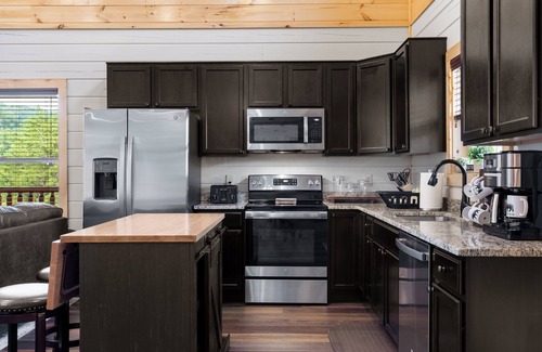 Take in beautiful mountain views under the covered porches, enjoying fresh mountain air and watching the clouds roll by while sipping your morning coffee or tea. Soak in the relaxing hot tubs or strike up a great conversation with friends and family about the day’s adventures at dinner shows, the Village Shops, Cades Cove or Wears Valley. As the sun goes down, glide in the Adirondack rockers on the deck, sip a glass of local wine or moonshine and barbecue on the gas grill.