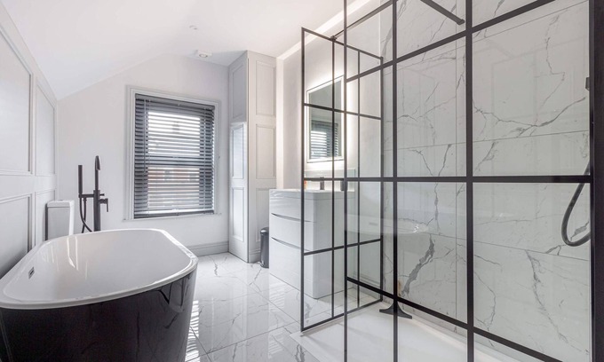 Upstairs, you’ll find the bedrooms, each with its own unique character and plenty of space to unpack and settle in comfortably. The property also offers two bathrooms for added convenience. The ground floor bathroom features a bathtub, while the beautifully decorated, marble-tiled main bathroom upstairs offers both a separate bath and an iconic walk-in shower, providing a luxurious space to relax and refresh during your stay.