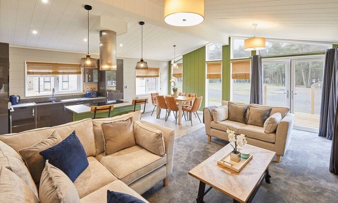 Spread out across a ground floor, The Cabin In The Woods is a glamour spot designed to give you peace and tranquillity. At the very front of The Cabin is its heart, the combined living and kitchen area. Here you will find the perfect space in which to relax yourself. With the living room equipped with a two seater sofa and a three seater corner sofa that are both pleasingly decked out with plush cushions, this gives you the wondrous chance to spread out and take in the wall-mounted flatscreen, equipped with Netflix that you are more than welcome to sign into and peruse at your leisure.