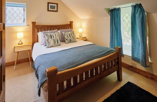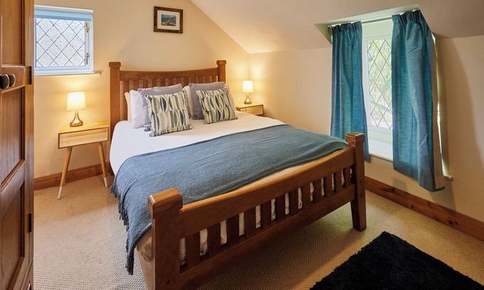 The master bedroom at The Cottage is a cosy space with sloped ceilings and solid wood furniture. Featuring a comfortable double bed, you can enjoy a peaceful night’s sleep.