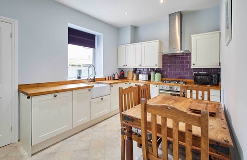 Combining modern and traditional elements, the kitchen cabinets are light cream with oak wood worktops. Fully equipped, you can make the most of your self-catering stay and prepare home cooked meals easily.