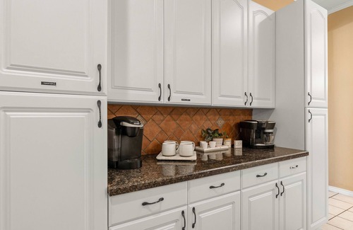 Fully Equipped Kitchen: The large kitchen is ready for all your catering needs, featuring granite counters and an island with seating, making it easy to prepare meals or snacks for your guests during your stay.
