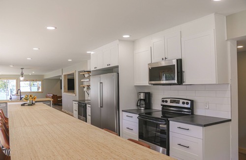 The main floor boasts an 18-foot island as well as dining table and seating for 25.