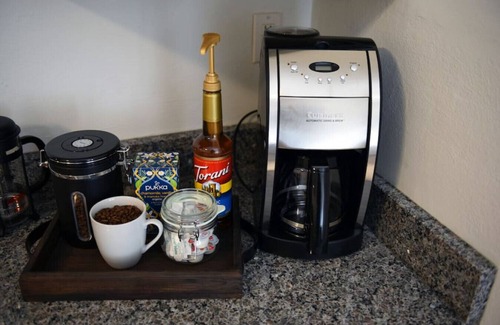 ➤ Coffee & Tea: Cuisinart drip coffee maker, French press, premium locally roasted Commonplace Coffee Roasters medium roast whole bean coffee, burr grinder, tea kettle, and premium tea selection is provided
