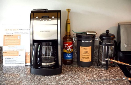 ➤ Coffee & Tea: Cuisinart drip coffee maker with built-in burr grinder, premium locally roasted Commonplace Coffee Roasters medium roast whole bean coffee, tea kettle, and premium tea selection is provided