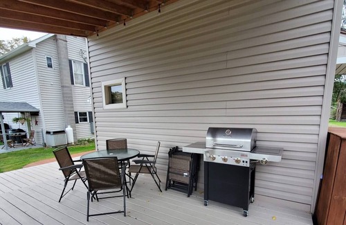 Living room provides smart tv with Xfinity Cable, and WiFi available throughout home. Rear deck for sunning, and covered deck with table and chairs, and gas grill with tools. Fire pit with roasting sticks, and pie irons available in shed. Locked bicycle storage available in shed on property.