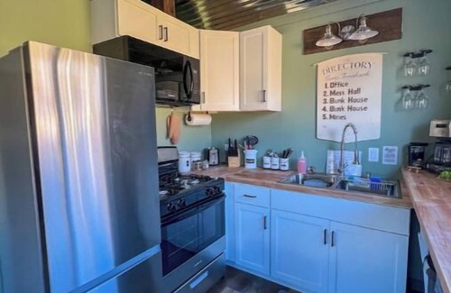 1 bedroom with bunk beds and a queen bed, a full bathroom, and a fully equipped kitchen. Heat and AC. 40 acres with logging trails to walk on.