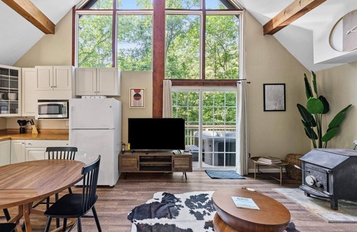 Tall Peak Chalet is a newly renovated chalet in the woods with high ceilings, tons of light, open floor plan, fully stocked kitchen, wraparound deck, a hot tub, grill, and fire pit – surrounded by beautiful mountain views. Perfect for your family, friends or small group. We’re dog-friendly!