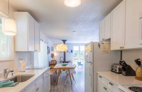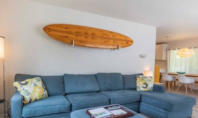 Stepping through the front door, you will feel right at home with the open floor plan, cozy wood stove, and sectional sofa that converts to a queen-sized hide-a-bed. The recent update for this home includes new floors and furnishings that reflect modern beach decor. The dining table can seat eight with the leaf inserted and is open to the newly remodeled kitchen. The well-stocked kitchen has beautiful quartz slab countertops, unique acrylic drawer pulls and cupboard knobs, and absolutely everything you'll need to prepare a delicious meal.