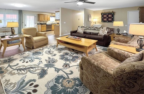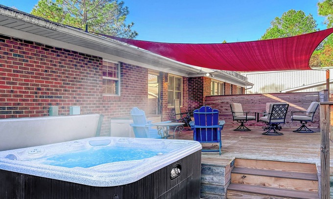 This pet-friendly, ranch-style home is perfect for families, military, and golfers alike. It features a hot tub, a fully equipped kitchen, cozy living spaces, BBQ grill, fire pit, and a large backyard. Enjoy complimentary coffee on the screened-in front porch or relax in the hot tub after a day out. Located on a quiet country road surrounded by woods, just 20 min from Pinehurst and 30 min from Fayetteville.