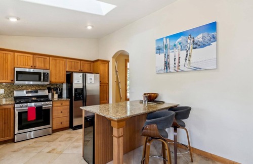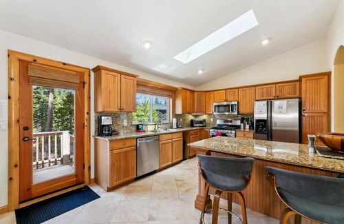 Welcome to our mountain home! The home is beautifully crafted and setup, including a large great room with fireplace and fully equipped kitchen with gas range and wine cooler, loft with foosball table, dining room and kitchen eating areas, two ensuite bathrooms, jetted soaking tub, easy entry (2 stairs) with a bedroom and a full bathroom on the entry level, 2 bedroom patio access, 8 beds including a 2 sets of bunk beds, 3 full bathrooms and one half bath, private hot tub in the back, an EV charger for your car, and plenty of seating for lounging or enjoying a meal after a fun day in Tahoe.