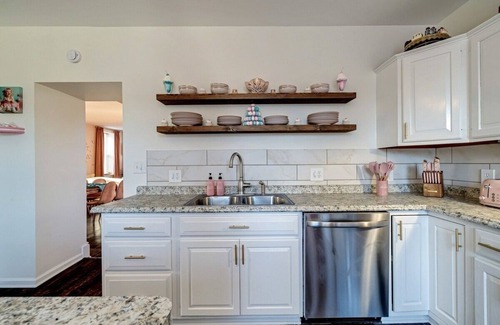 -KITCHEN: The large, updated kitchen is well equipped with- utensils, pots, pans, dishes, bakeware, etc. along with all the appliances you will need to make a large family meal on your vacation. Appliances are A fun retro design- A perfect backdrop for photos and work just as well as any modern appliance.
