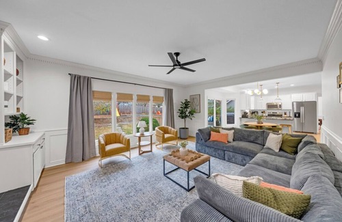 This house is designed for both fun and relaxation, with an array of amenities to keep everyone entertained. Enjoy friendly competitions on the outdoor bowling alley or cornhole game. Test your putting skills on the three-hole turf putt putt course. You can find our sports-themed pool table room on the main level of the home. The giant game room is a paradise for gamers, with a foosball table, air hockey, and arcade games (NBA Jam, Pacman, NFL Blitz), while the speakeasy-themed poker lounge/bar area is perfect for a game of poker on the 10-person table. Movie buffs will love the home theater room with a 120" projector screen with surround sound and a massive sectional couch, providing an immersive movie-watching experience. With 8 smart TVs throughout the property, you won’t have to go far to stream the latest shows or cheer on your favorite sports team.