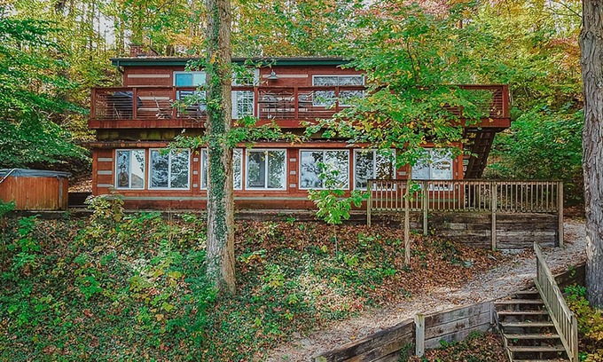 Soaring Eagle Cabin is located on Lake Monroe's backwater and is surrounded by nature. This low-maintenance house has two bathrooms, a large kitchen, a 4-person hot tub, and a game room with a double Murphy bed.